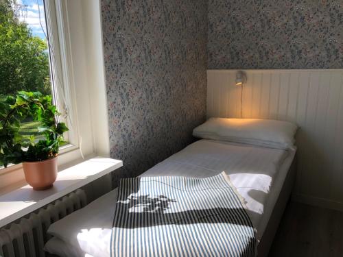 De enkelt inredda rummen på Helsingegården har ett handfat och delat badrum.